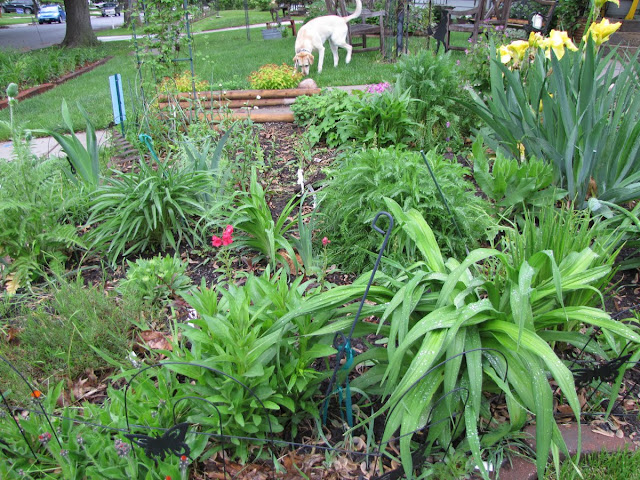 Have you noticed Heidi in the photos? She sees me with my camera, and gets all excited to go outside. We've turned the corner, and are now facing west. The orange hawkweed, pine leaf penstemon, Helen's flower, red hot poker, and blanket flower were already in the circle bed. Did I mention it had an orange theme?