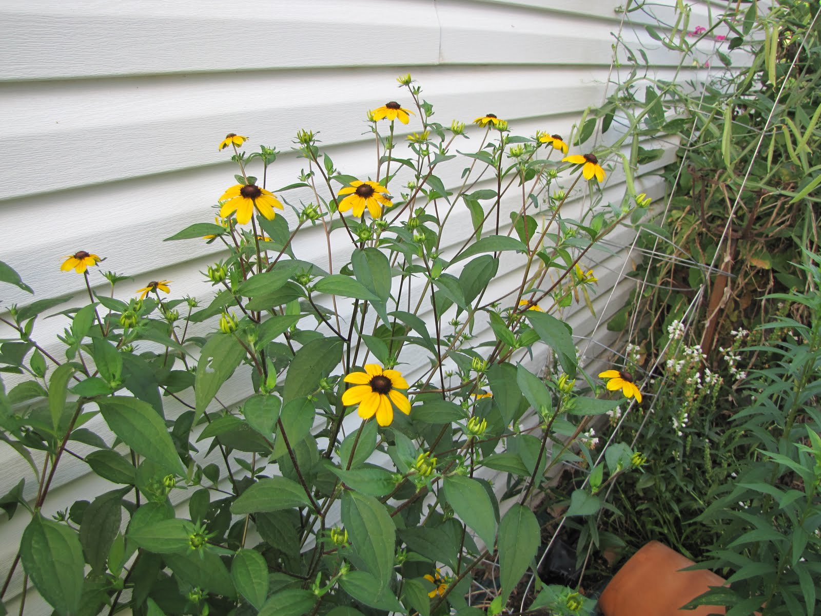 I don't know the name of this, but I'm thinking they are a rudbeckia of some kind. I pull out a lot of seedlings some years, because I don't want it to take over. This is the north side of the garage, so it's not full sun, but I think it prefers full sun. That's white obedient plant between this and some sweet peas.