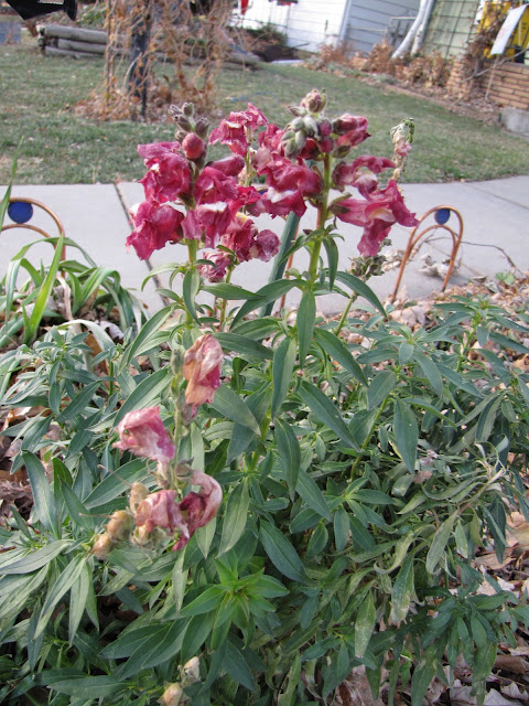 Here's the clump of snapdragons behind the iris in the previous photo. All of the snapdragon plants are still green, and some have buds.