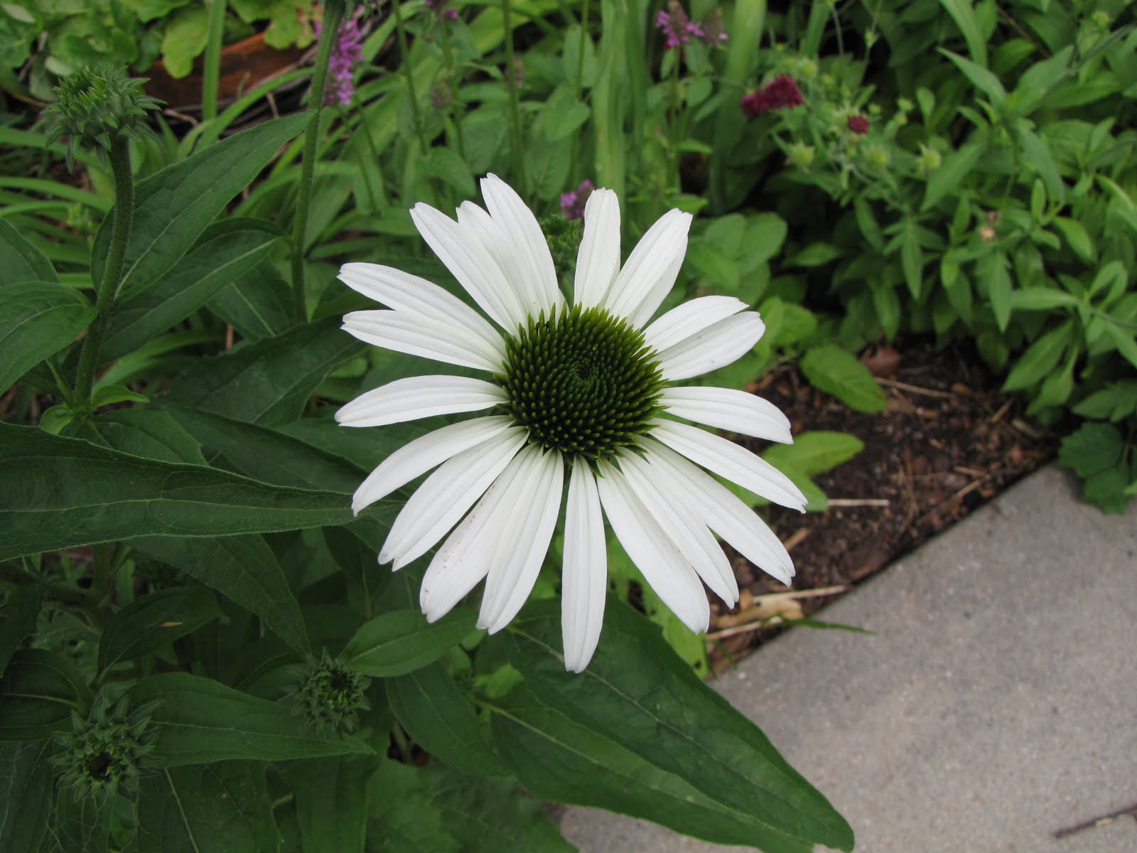 I have lots of young echinacea plants that are a result of the different ones that have bred with each other. This one looks like the original white one I had when we first moved here. I had divided it, and put some in this area of the east bed, and it reverted to a light purple.