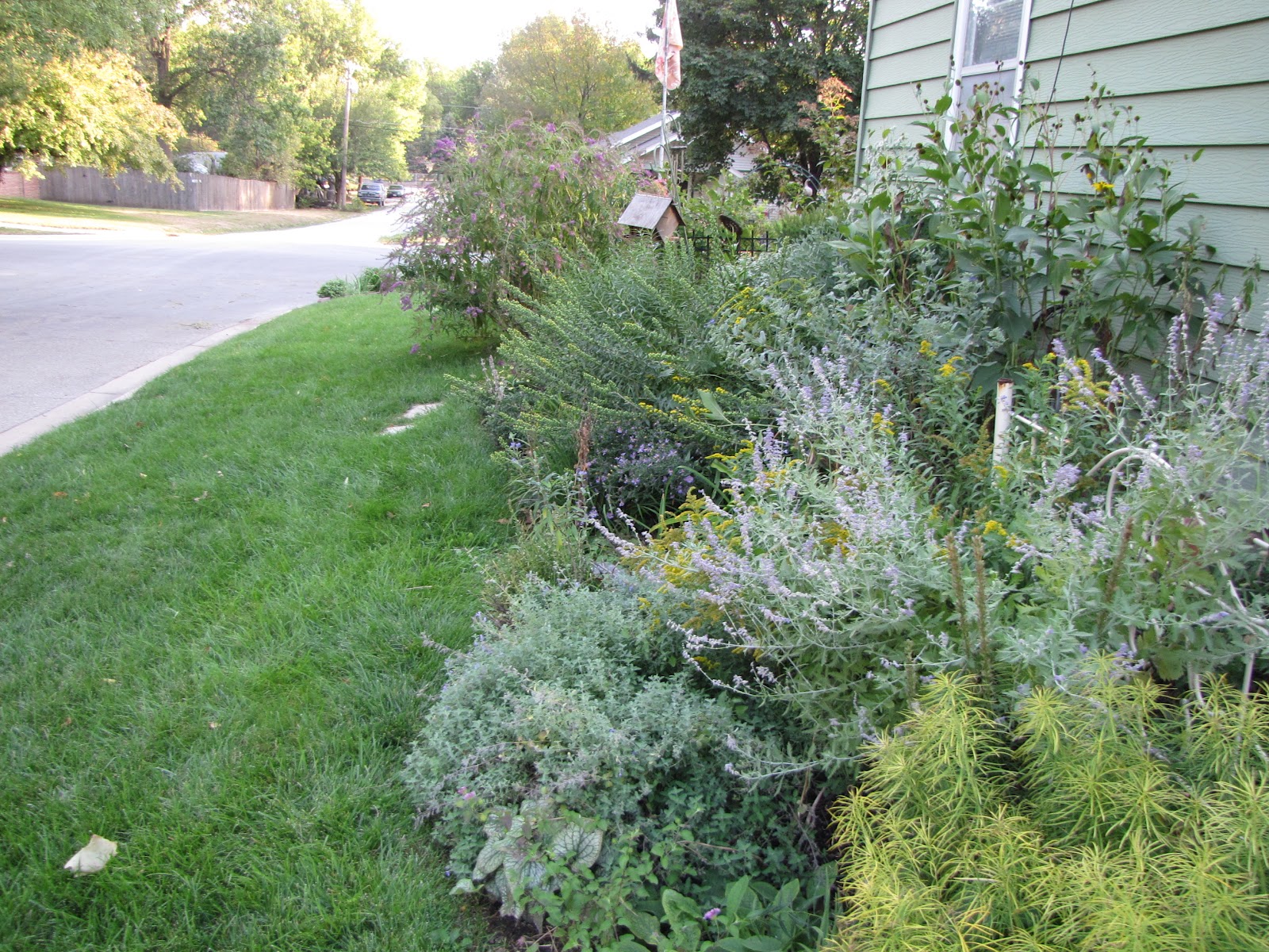 The plants on the east side of the house survived the hot, dry summer. Most of the area gets watered from the underground sprinkler system, which I ran more than I would have if we hadn't had only certain days we could water, because I didn't have time on those days to water by hand. I am hoping to be finished putting in new plants soon, so that the whole yard won't need as much watering.