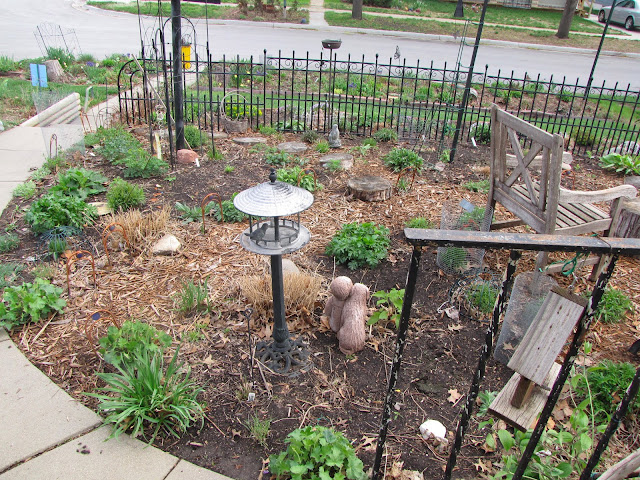 Facing north, I look forward to seeing what the area will look like in a few weeks. I grew Tithonia for the monarchs in the area right in front of the porch last year. Last fall, I planted Illinois bundleflower. There are some seedlings coming up, but I can't tell yet if that's what they are. They have been slow to grow. Maybe the warm temps we are expecting in a few days will help. Last week, I planted a Rudbeckia submentosa next to the little boy with a dog. Liatris and Purple prairie clover are a couple of the rabbits' favorite foods, so that's why they have cages over them.