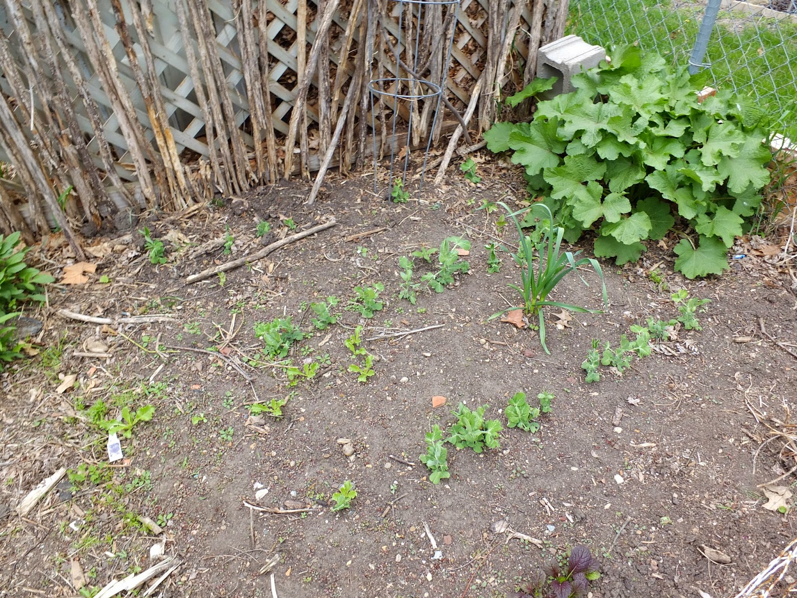 I have lots coming up! I started planting in January, and can't remember when I planted these, but it was probably March. There is some asparagus in here that came up from the plants across the garden. I decided to keep them there and see how they do. I have random flowers on the side of the garage, goldenrod, brown eyed susans, and sometimes the white blooming obedient plants escape my pulling.